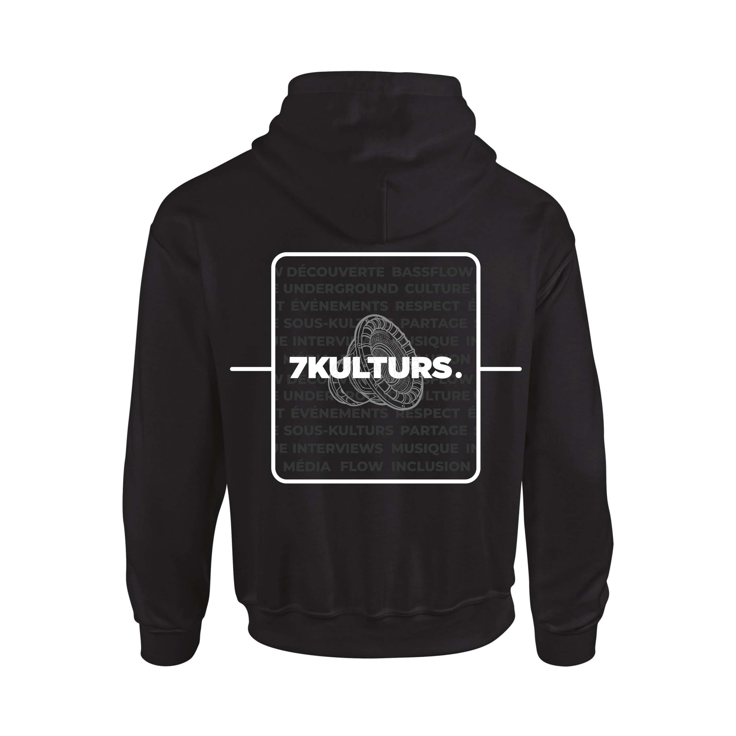 Nous avons créé un sweat à capuche l’effigie de notre asbl 7kulturs avec un visuel reprenant nos différentes valeurs et actions pour la culture de la musique électronique underground. Un moyen en plus de soutenir notre association, avec style.